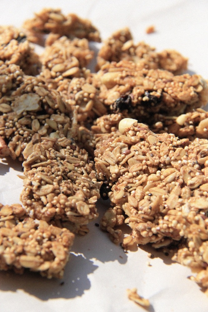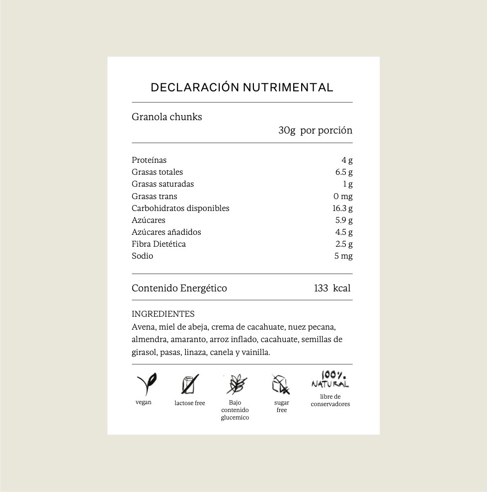 Es una granola artesanal elaborada con hojuelas de avena, frutos secos y semillas, endulzada con miel de abeja.