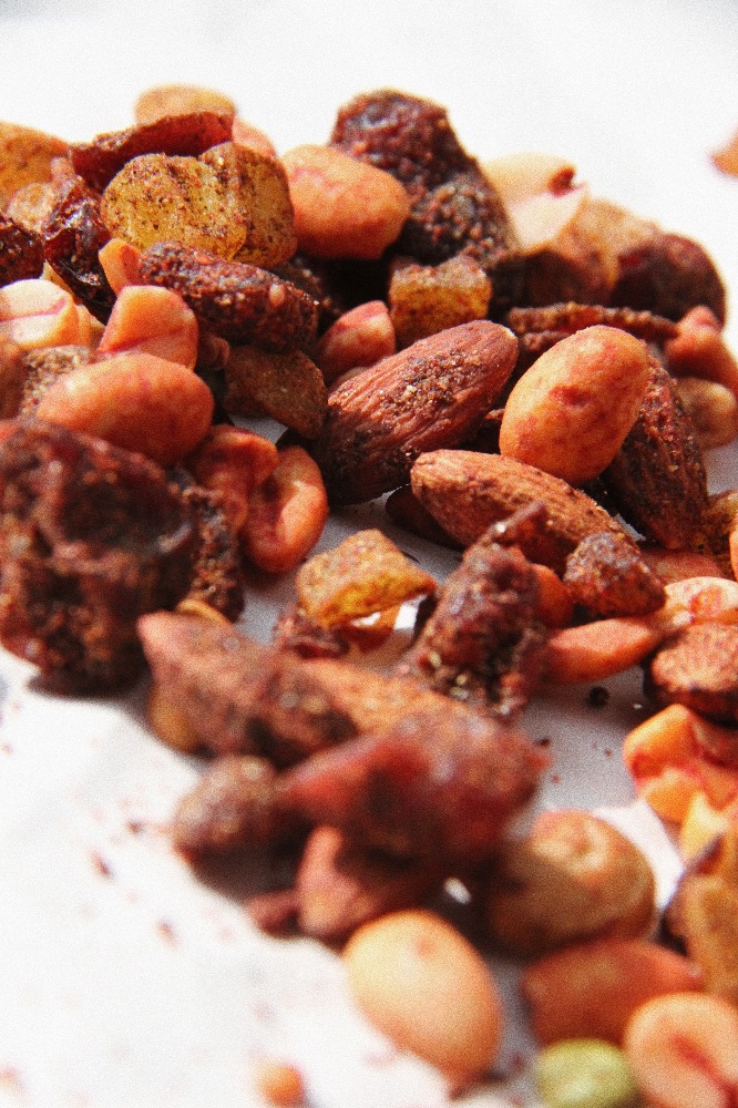 Deliciosa combinación de piña enchilada, cacahuate enchilado, arándano enchilado, almendras enchiladas y nuez de la India enchilada.
